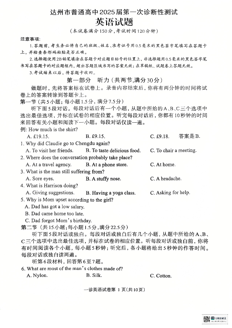 四川省达州市普通高中 2025 届第一次诊断性测试英语