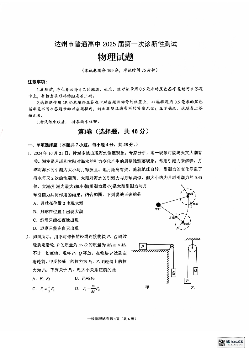 四川省达州市普通高中 2025 届第一次诊断性测试物理