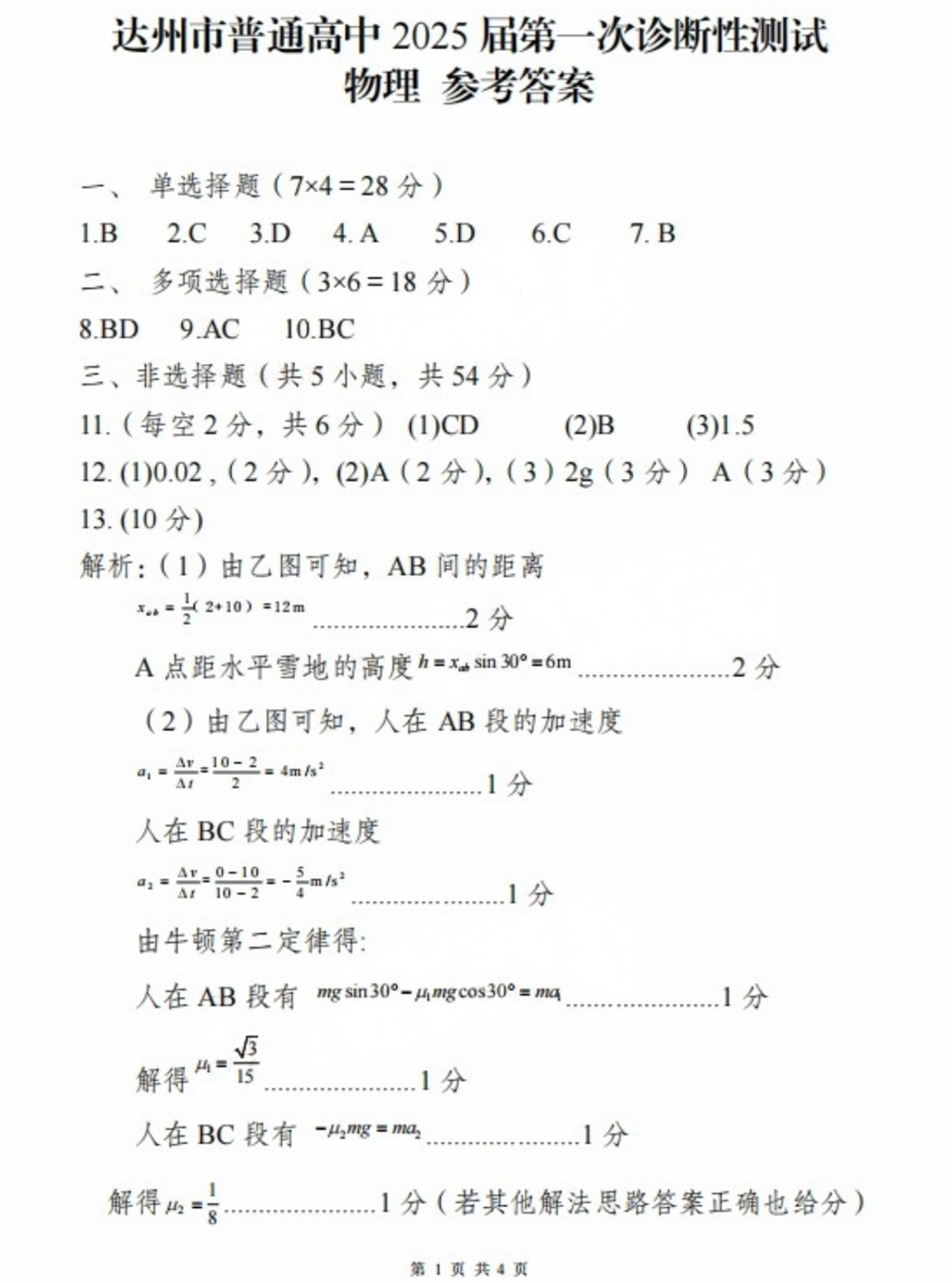 四川省达州市普通高中 2025 届第一次诊断性测试物理答案
