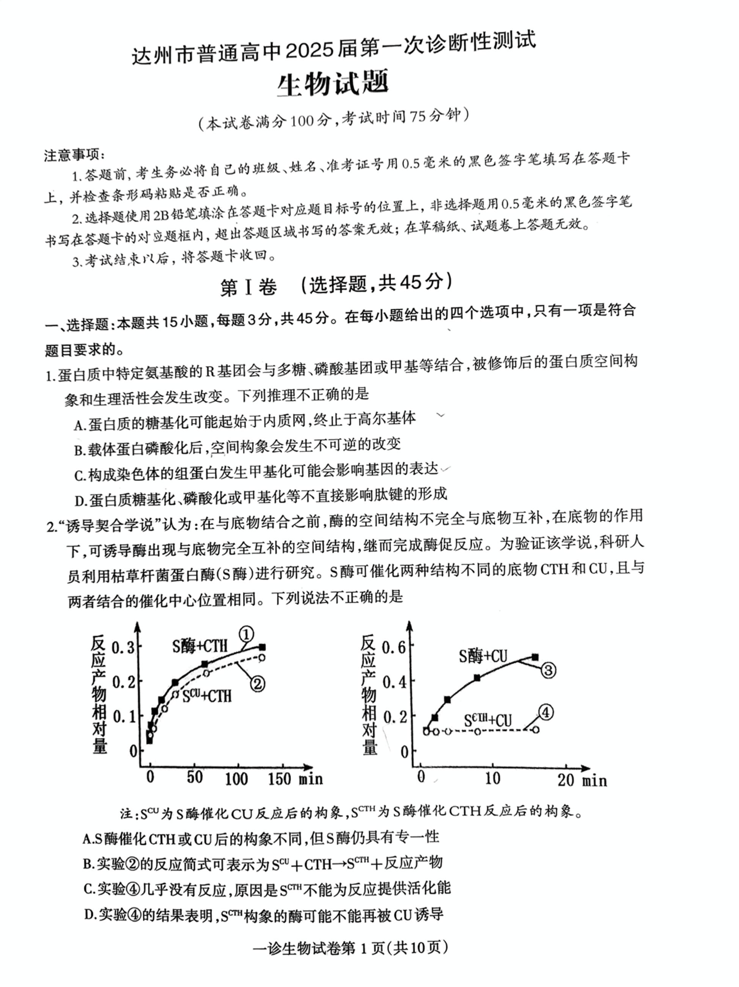 四川省达州市普通高中 2025 届第一次诊断性测试生物