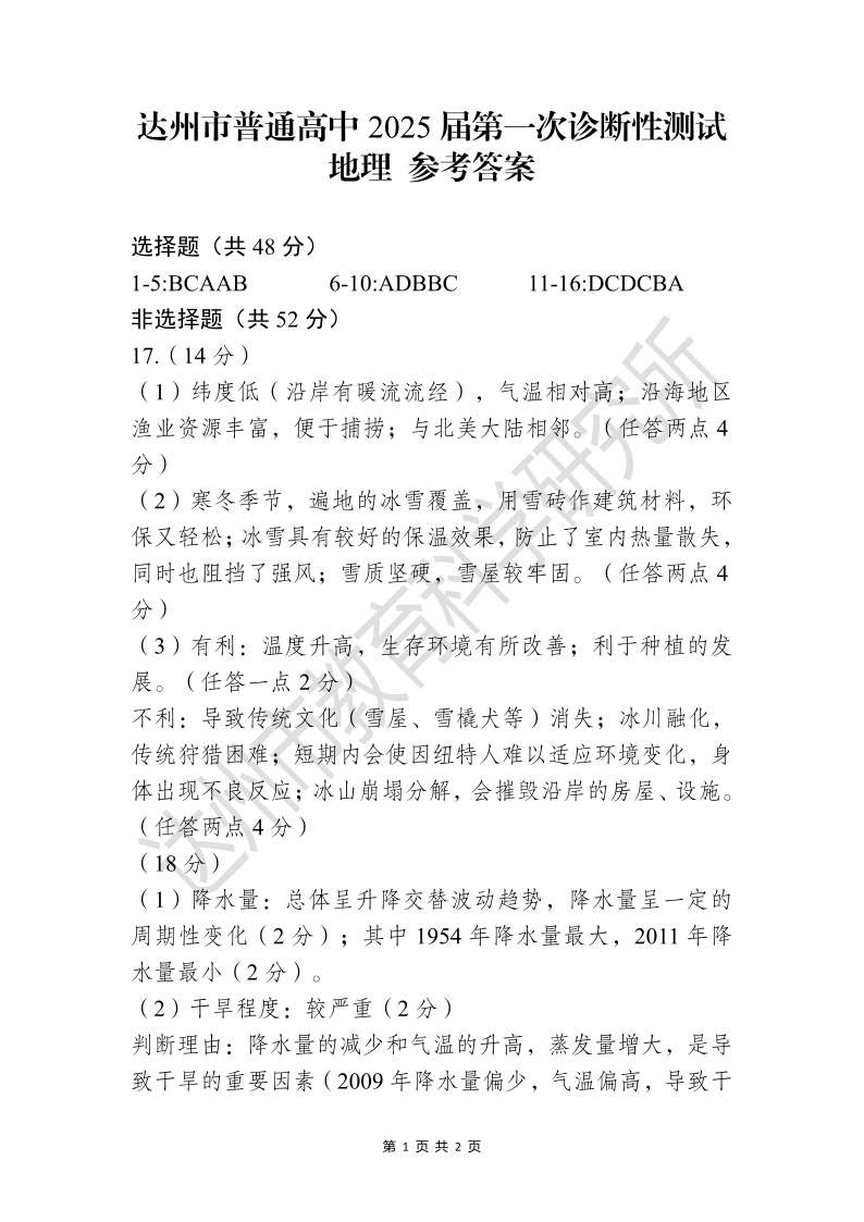 四川省达州市普通高中 2025 届第一次诊断性测试地理答案