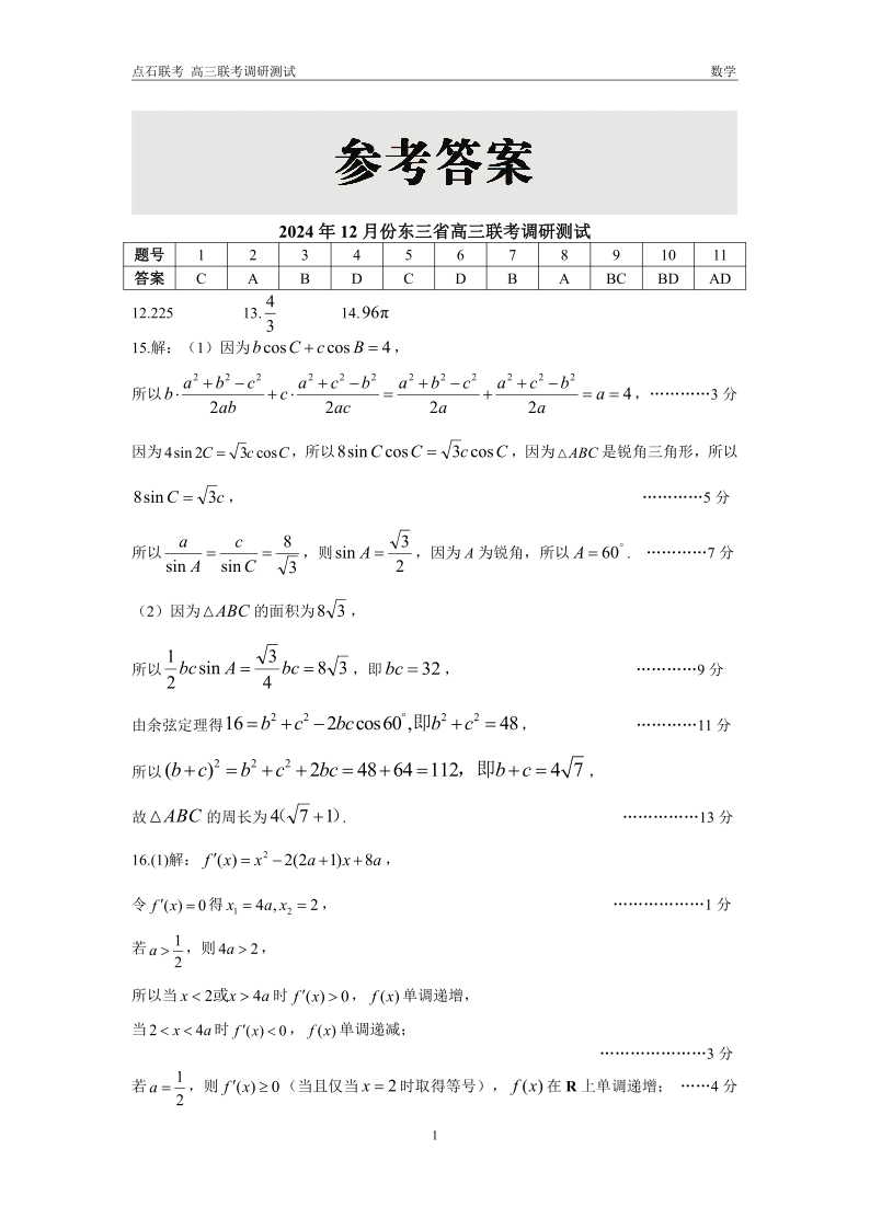 东北三省2025届高三上学期12月调研测试数学答案