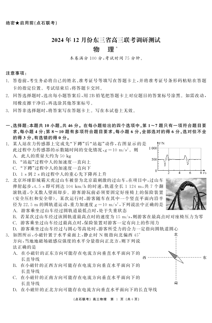 东北三省2025届高三上学期12月调研测试物理