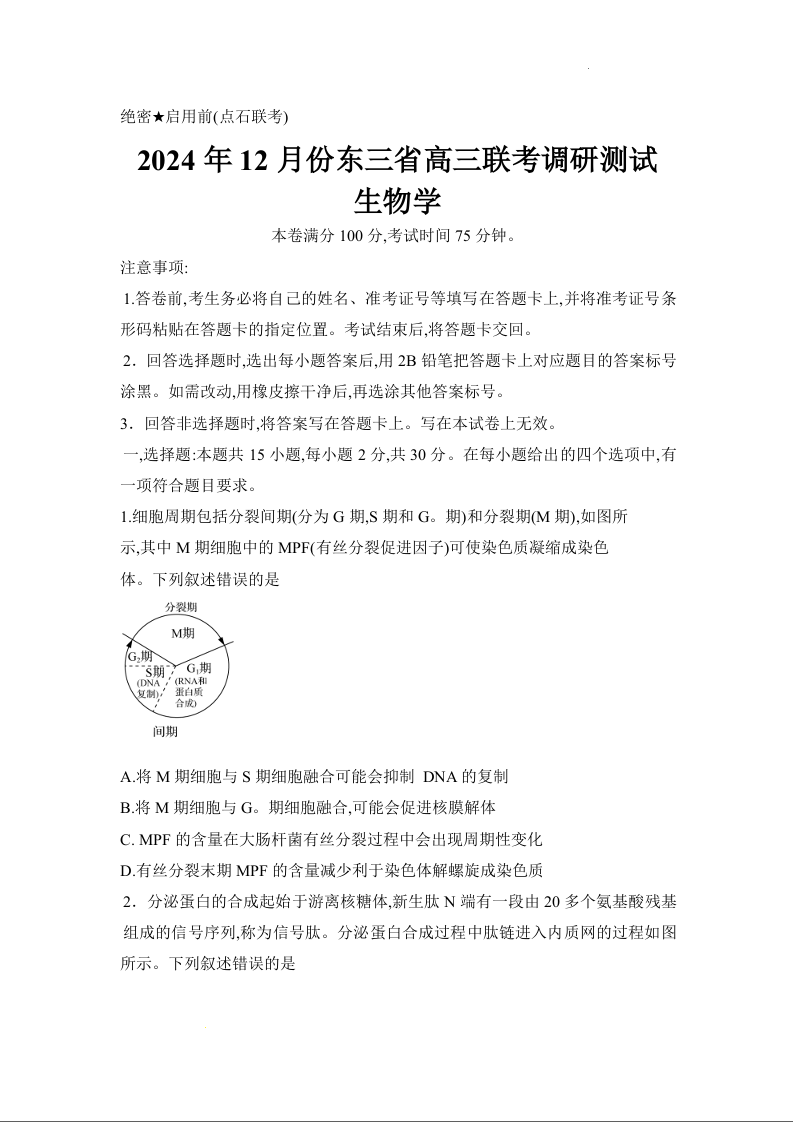 东北三省2025届高三上学期12月调研测试生物