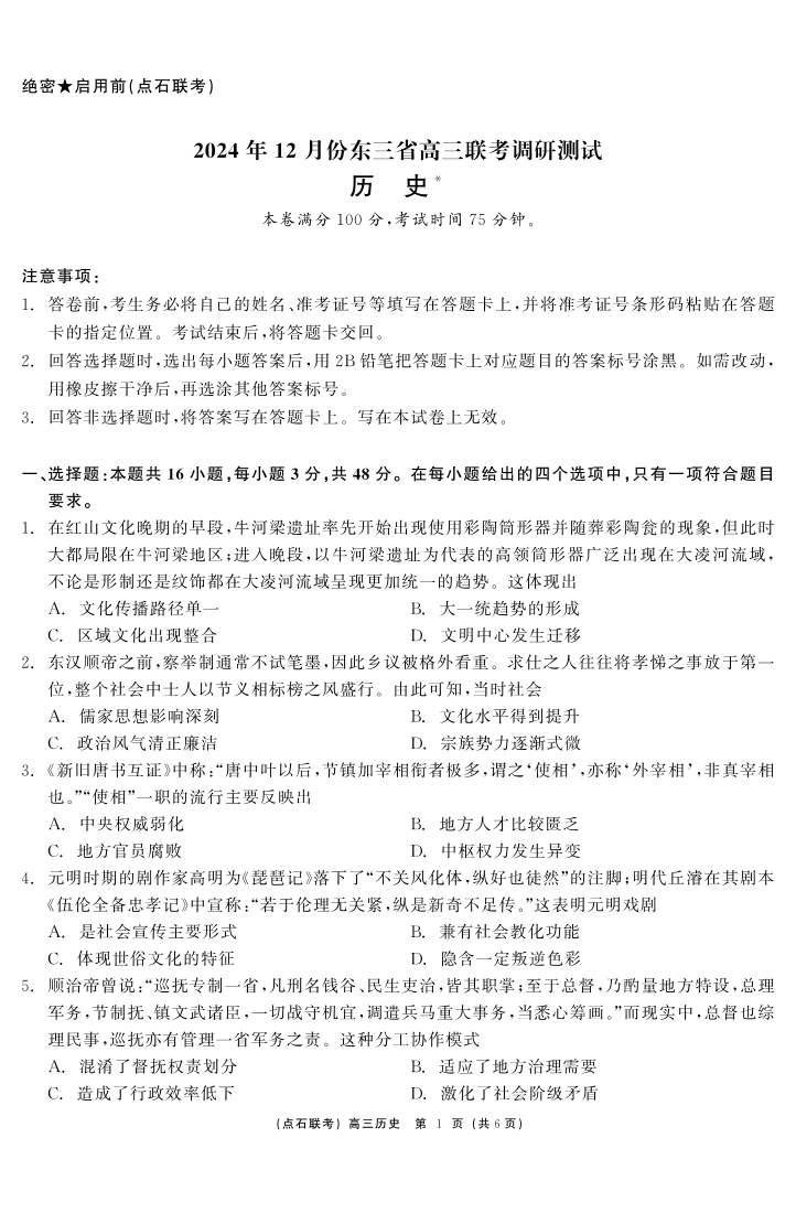 东北三省2025届高三上学期12月调研测试历史