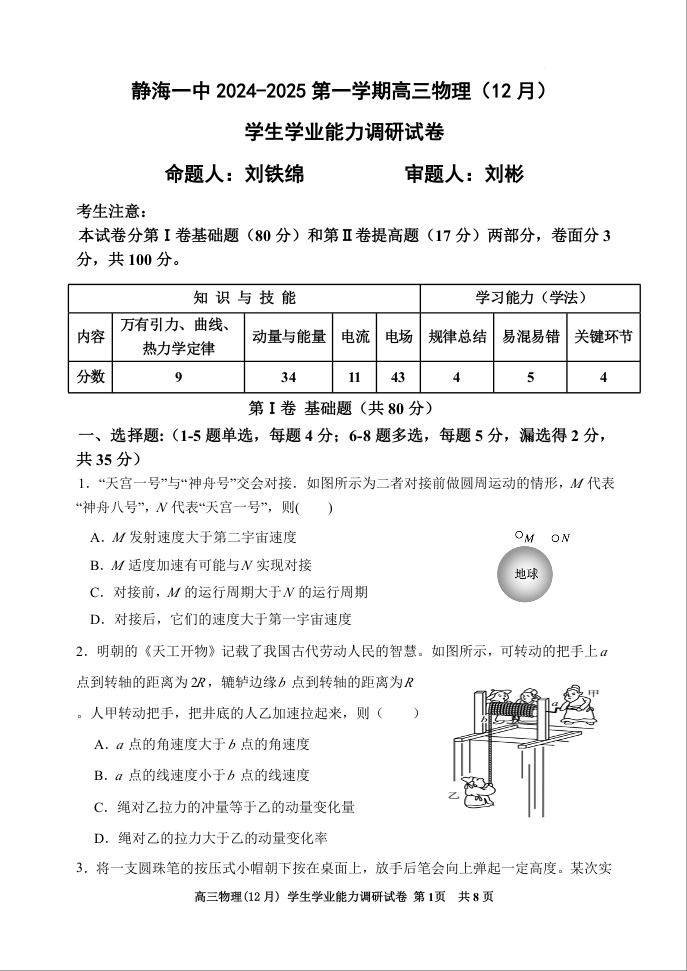 天津市静海区第一中学2025届高三上学期12月月考物理Word版含答案