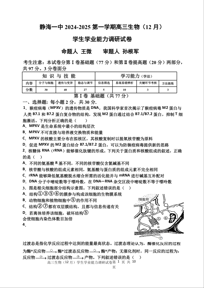 天津市静海区第一中学2025届高三上学期12月月考生物Word版含答案