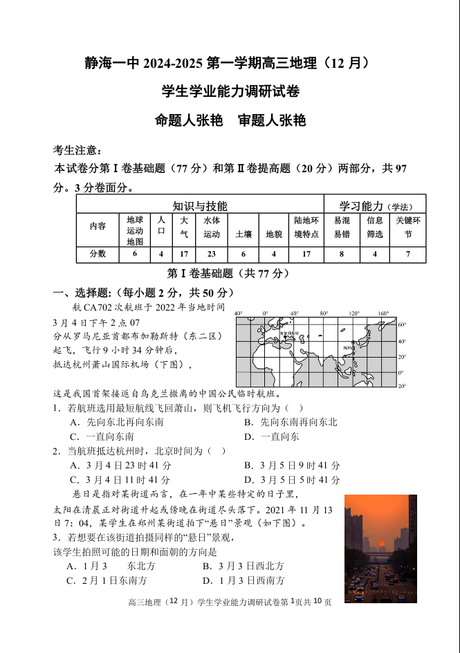 天津市静海区第一中学2025届高三上学期12月月考地理Word版含答案