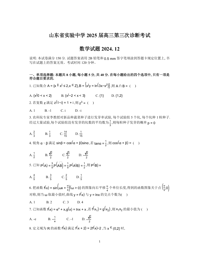 山东省实验中学2025届高三年级第三次诊断考试数学