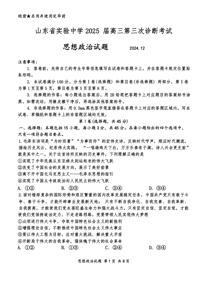 山东省实验中学2025届高三年级第三次诊断考试政治