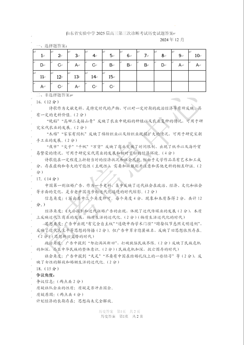 山东省实验中学2025届高三年级第三次诊断考试历史答案