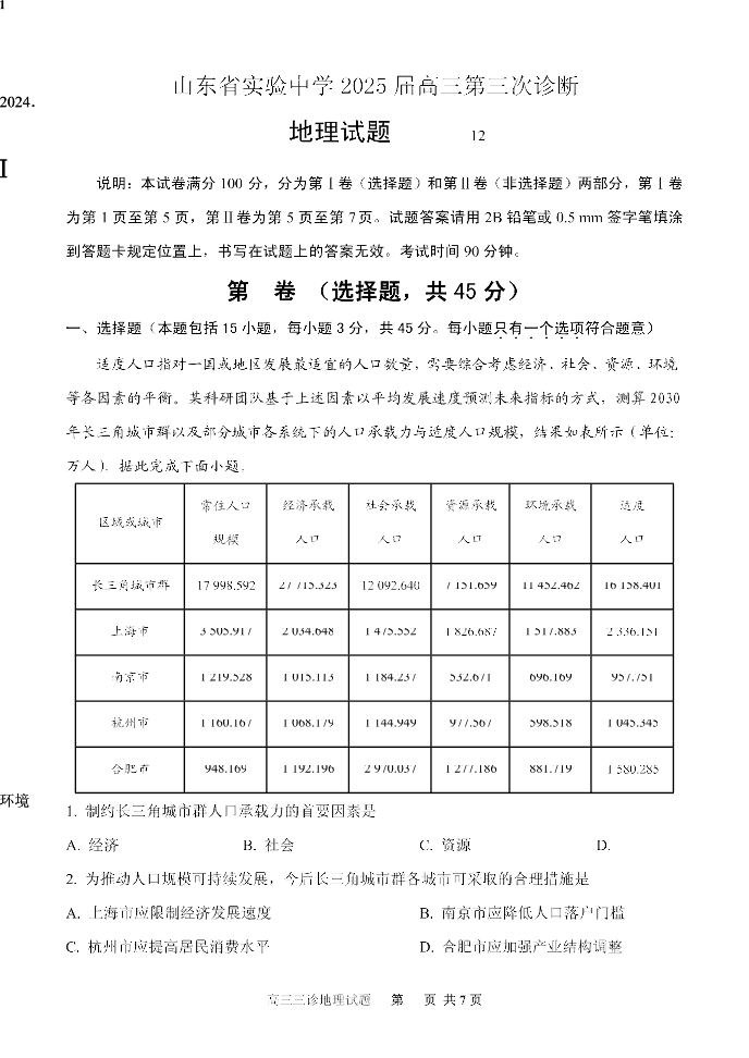 山东省实验中学2025届高三年级第三次诊断考试地理