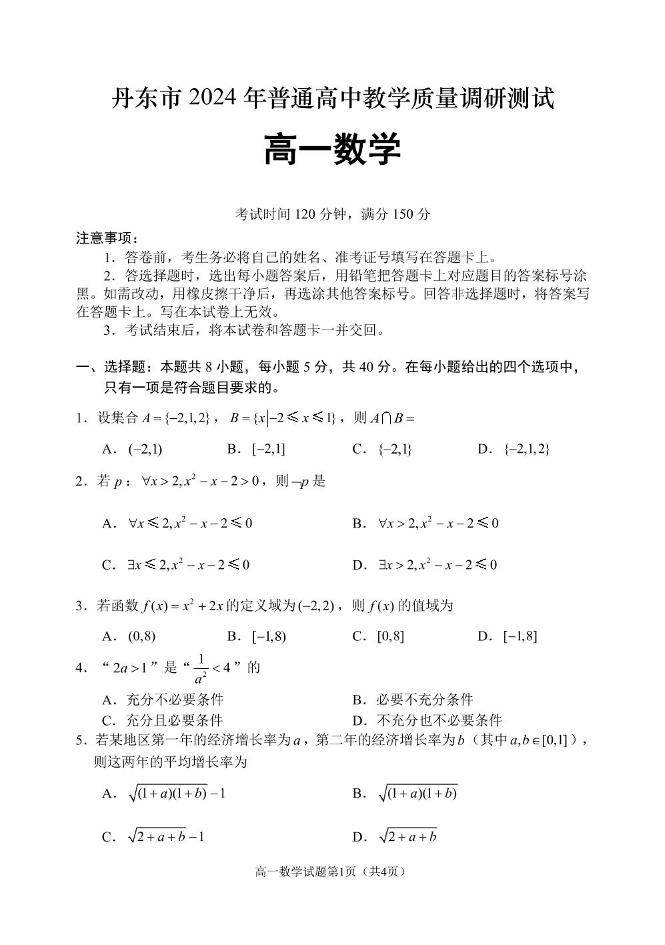 辽宁省丹东市2024-2025学年高一上学期12月教学质量调研测试数学