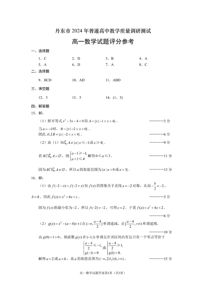 辽宁省丹东市2024-2025学年高一上学期12月教学质量调研测试数学答案