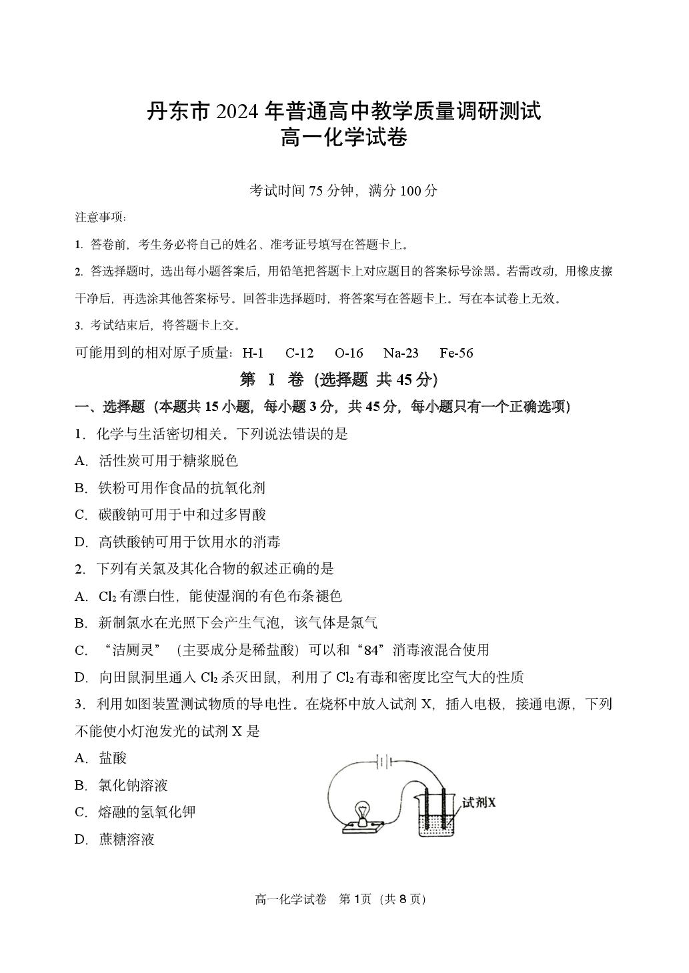 辽宁省丹东市2024-2025学年高一上学期12月教学质量调研测试化学