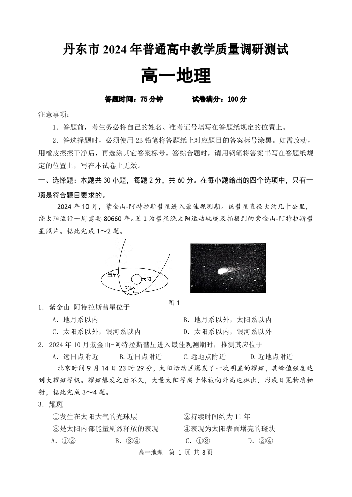 辽宁省丹东市2024-2025学年高一上学期12月教学质量调研测试地理