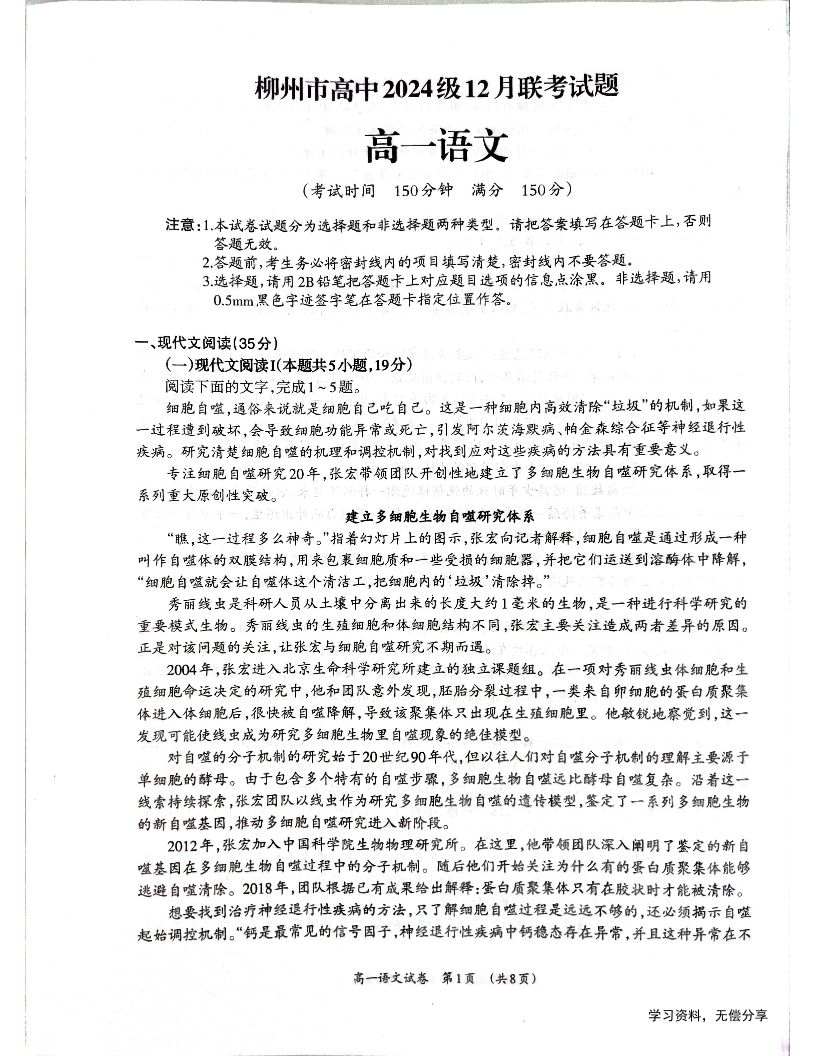 广西省柳州市2024-2025学年高一年级上学期12月联考语文