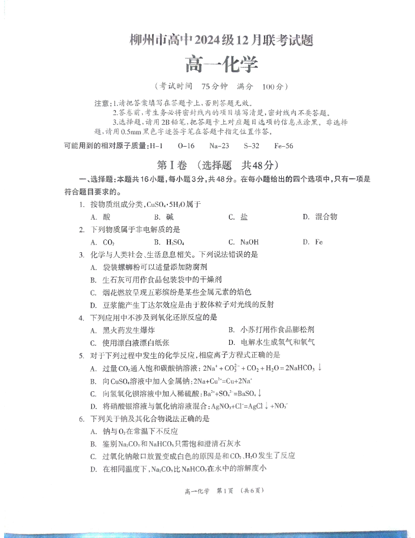 广西省柳州市2024-2025学年高一年级上学期12月联考化学