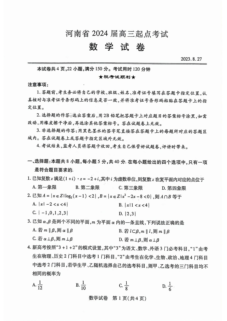 河南省2023.8高三年级起点开学考试数学