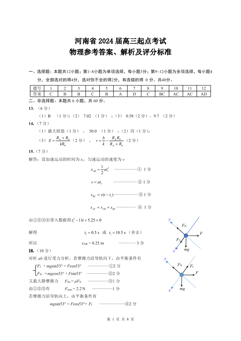 河南省2023.8高三年级起点开学考试物理答案
