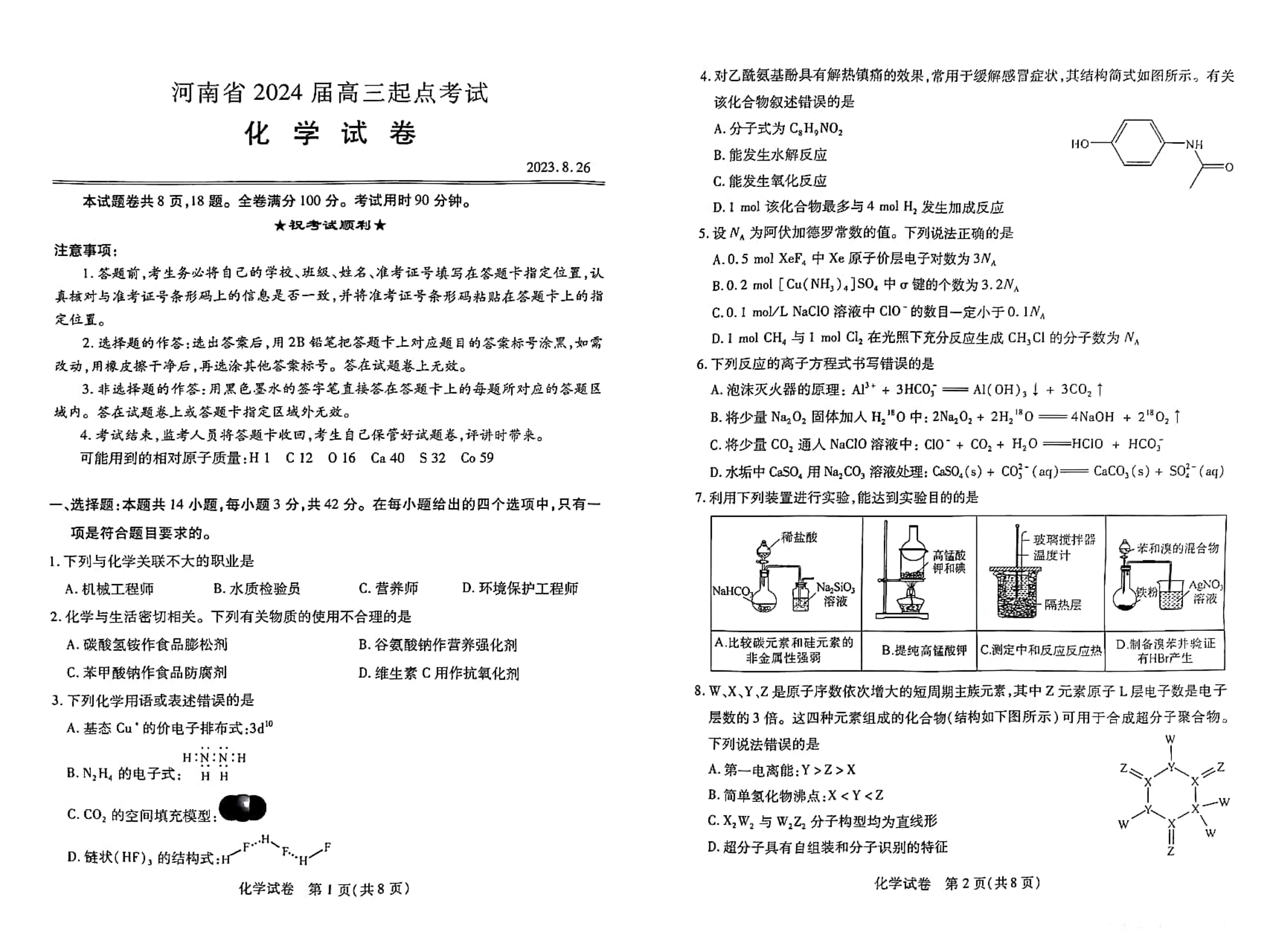 河南省2023.8高三年级起点开学考试化学