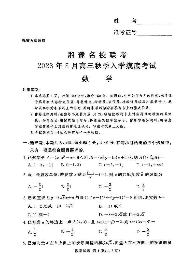 河南省湘豫名校2023.8高三年级入学摸底考试数学