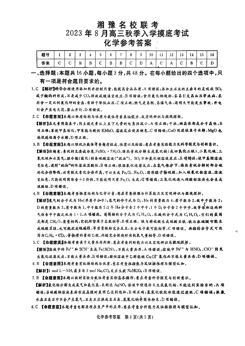 河南省湘豫名校2023.8高三年级入学摸底考试化学答案