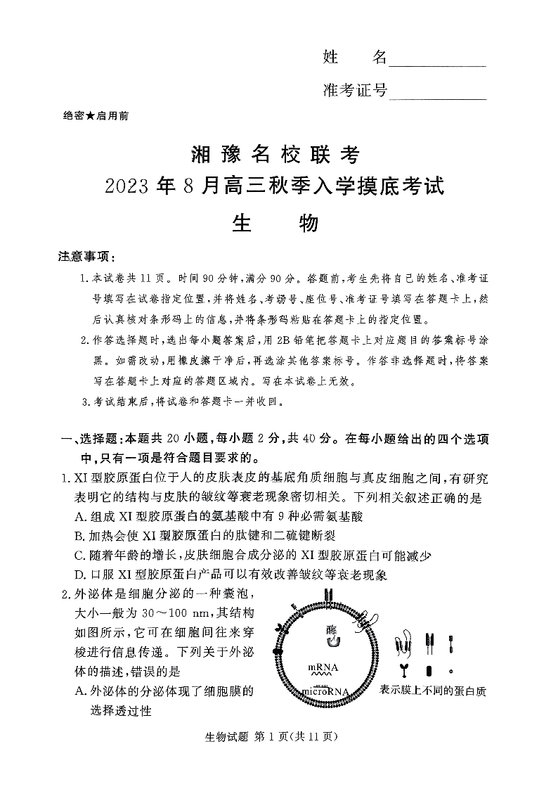 河南省湘豫名校2023.8高三年级入学摸底考试生物