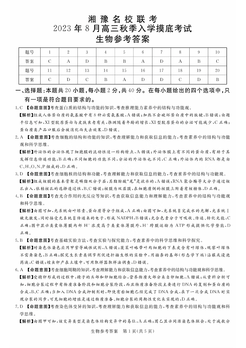 河南省湘豫名校2023.8高三年级入学摸底考试生物答案