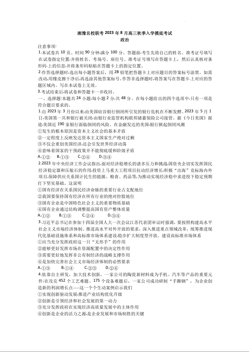河南省湘豫名校2023.8高三年级入学摸底考试政治