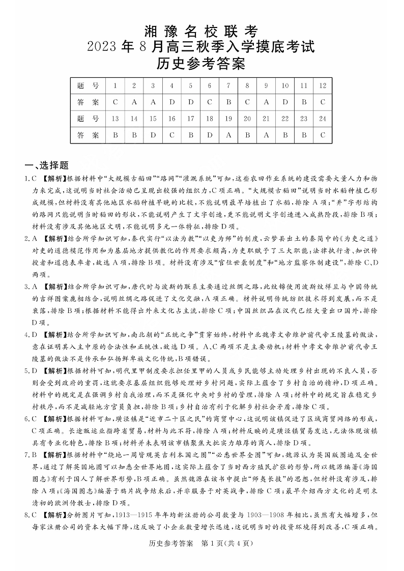 河南省湘豫名校2023.8高三年级入学摸底考试历史答案