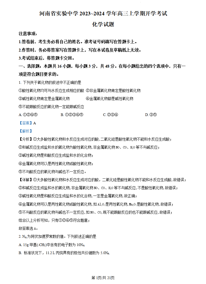 河南省实验中学2023.9高三年级开学考试化学+答案