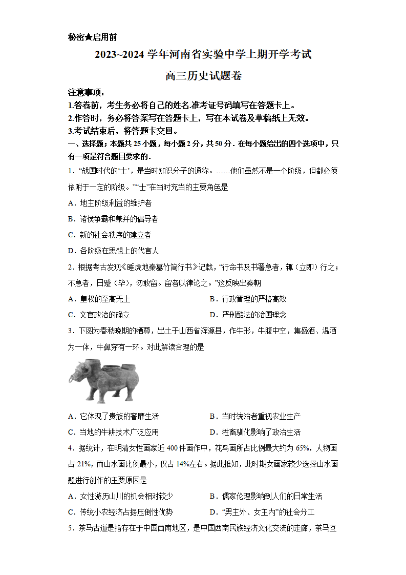 河南省实验中学2023.9高三年级开学考试历史+答案