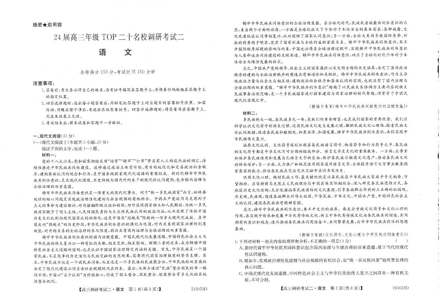 河南省TOP二十名校2023.9高三年级调研考试二语文