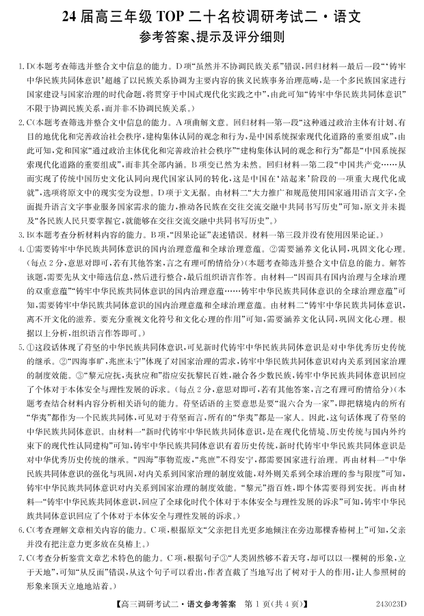 河南省TOP二十名校2023.9高三年级调研考试二语文答案