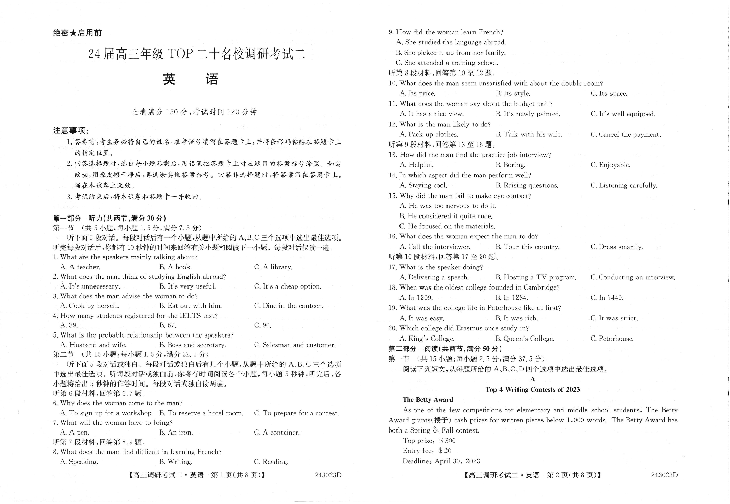 河南省TOP二十名校2023.9高三年级调研考试二英语