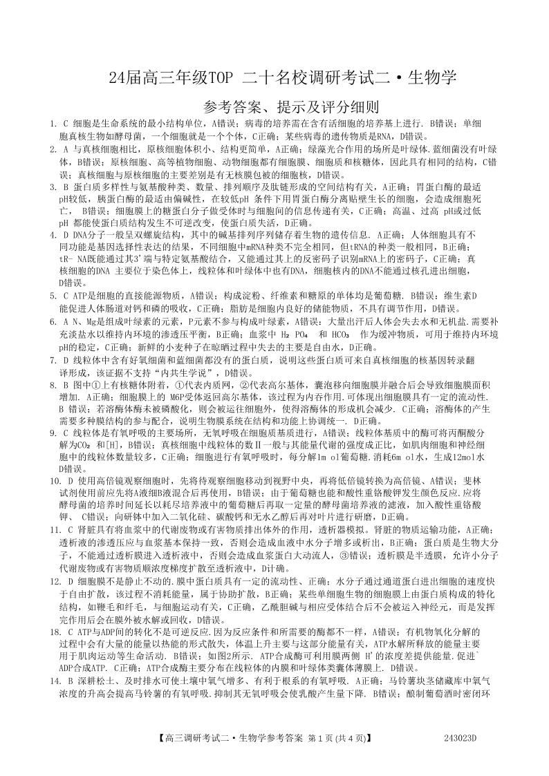 河南省TOP二十名校2023.9高三年级调研考试二生物答案