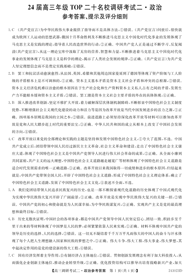 河南省TOP二十名校2023.9高三年级调研考试二政治答案
