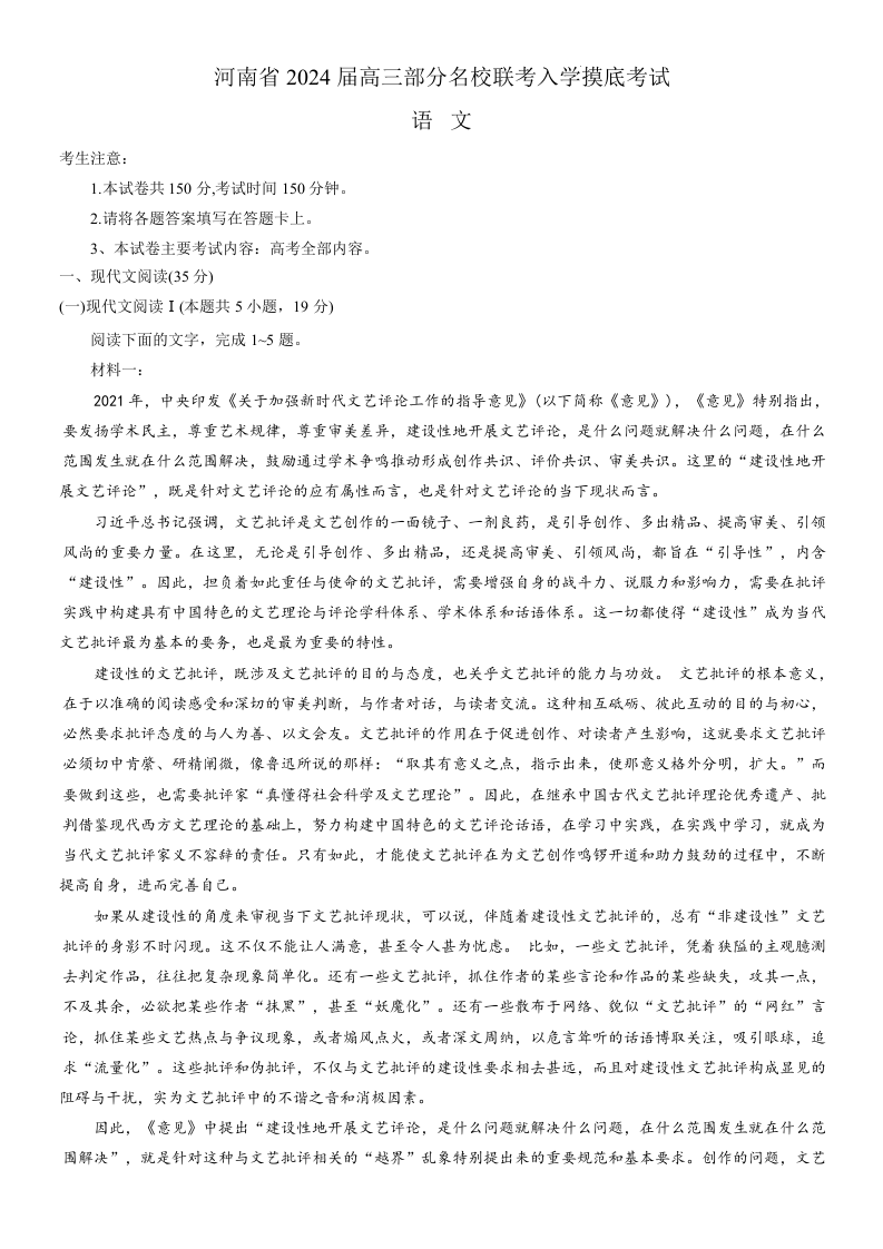 河南省部分名校2023.8高三年级入学摸底联考语文+答案