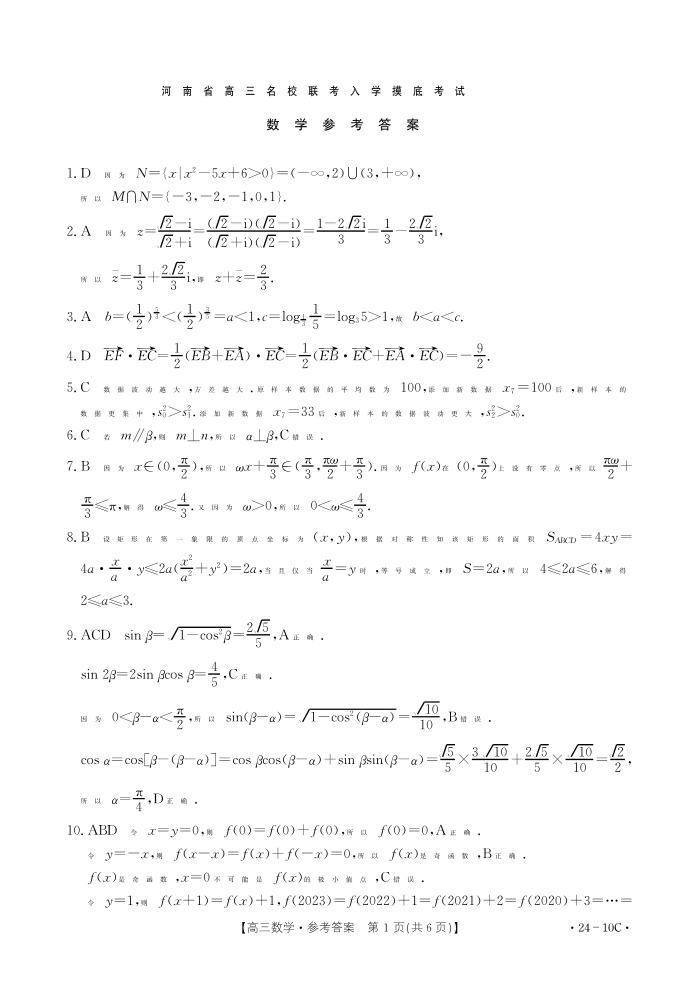 河南省部分名校2023.8高三年级入学摸底联考数学答案