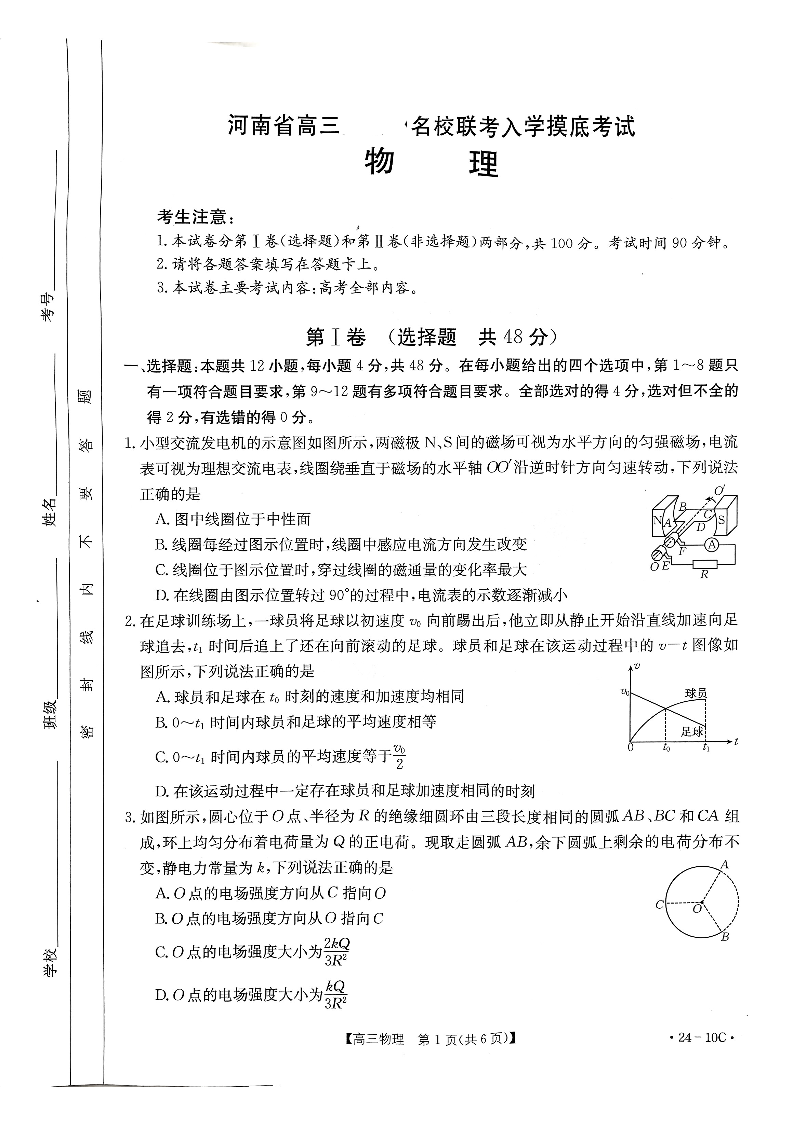 河南省部分名校2023.8高三年级入学摸底联考物理