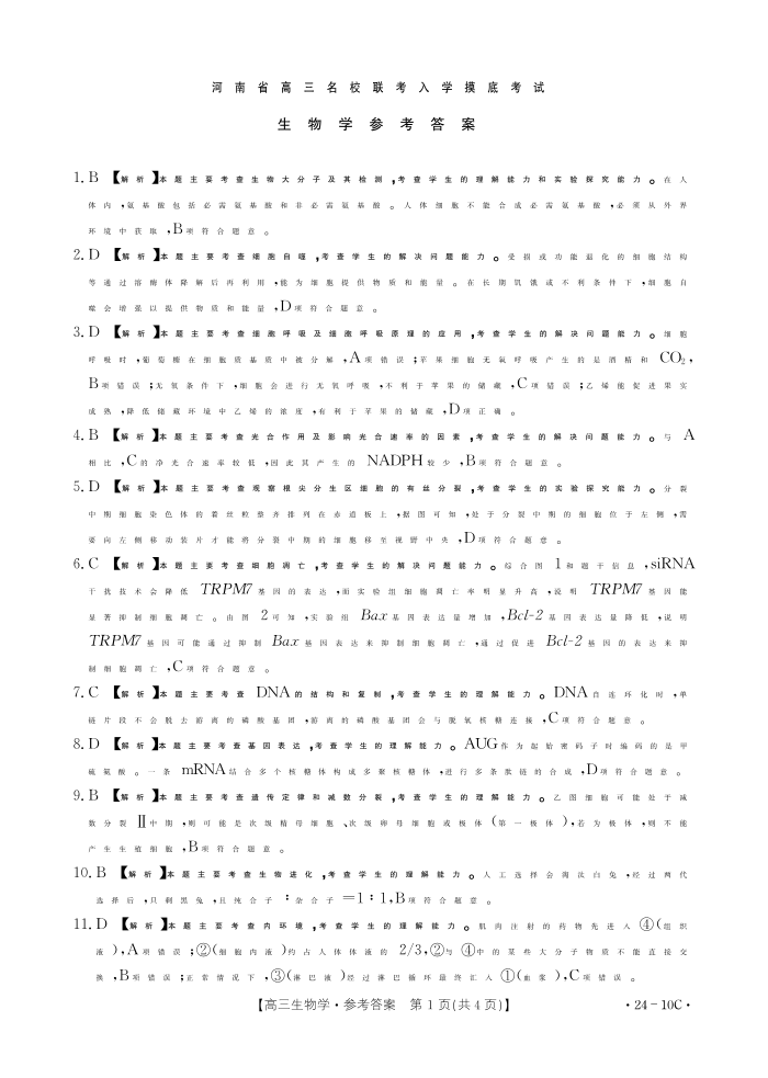 河南省部分名校2023.8高三年级入学摸底联考生物答案