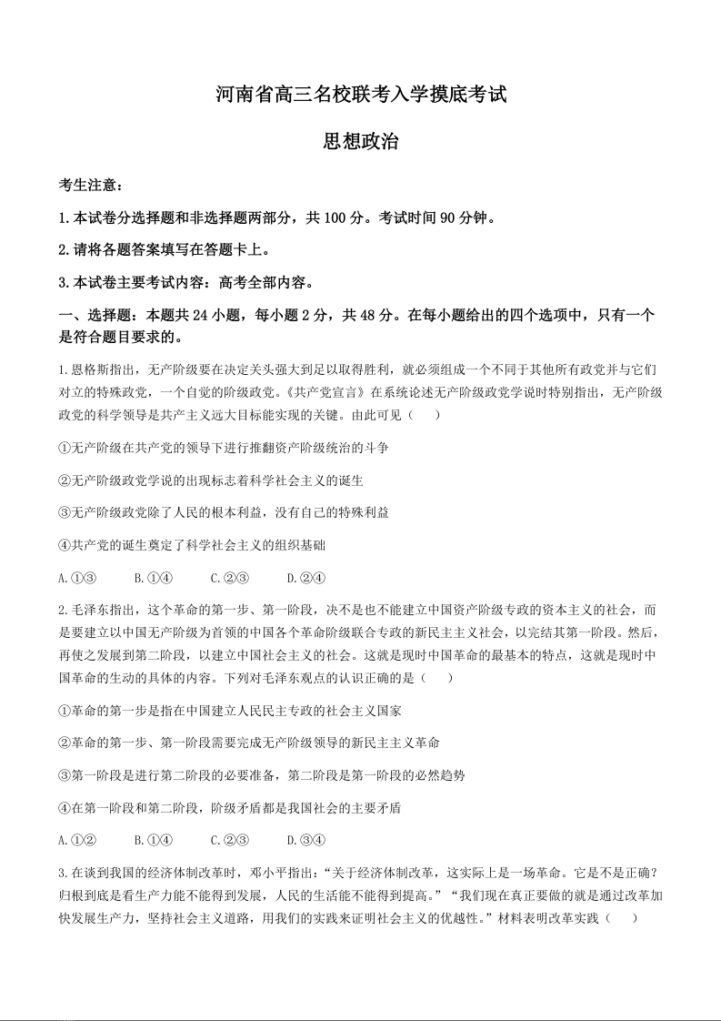 河南省部分名校2023.8高三年级入学摸底联考政治+答案