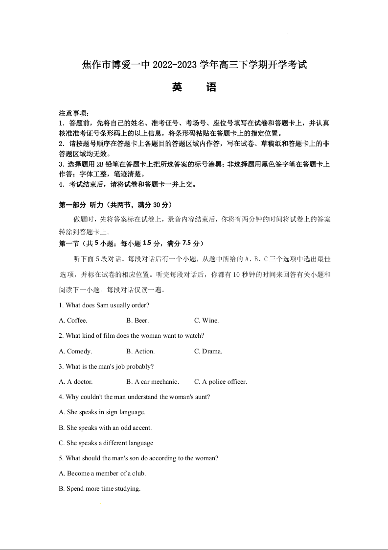 河南省焦作市博爱一中2023.9高三年级开学定位考试英语