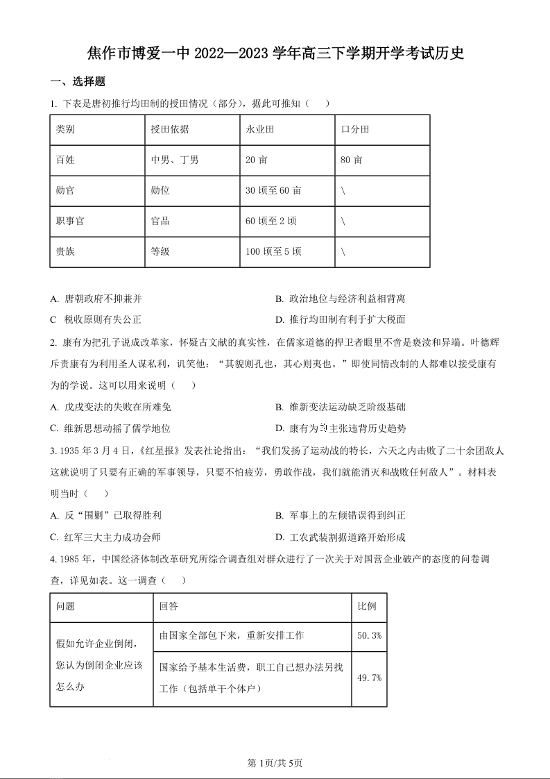 河南省焦作市博爱一中2023.9高三年级开学定位考试历史