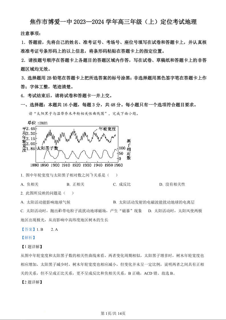 河南省焦作市博爱一中2023.9高三年级开学定位考试地理+答案解析