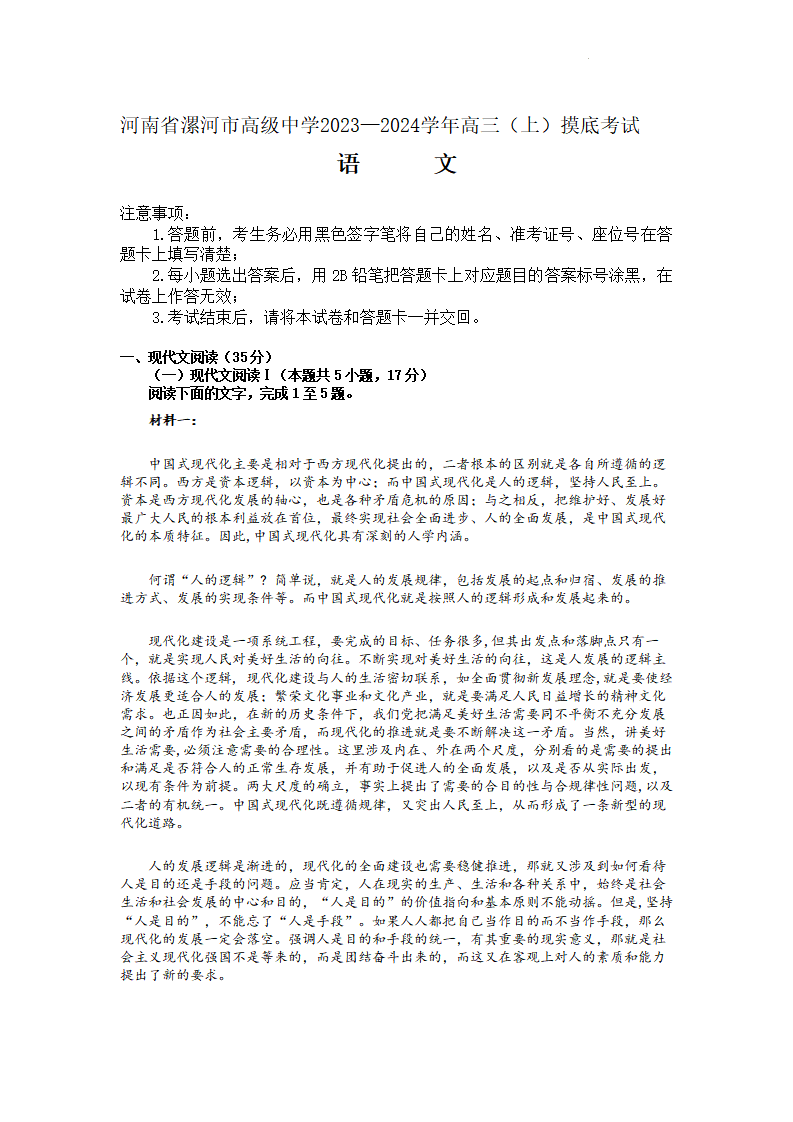 河南省漯河市高级中学2023.9高三年级摸底考试数学语文
