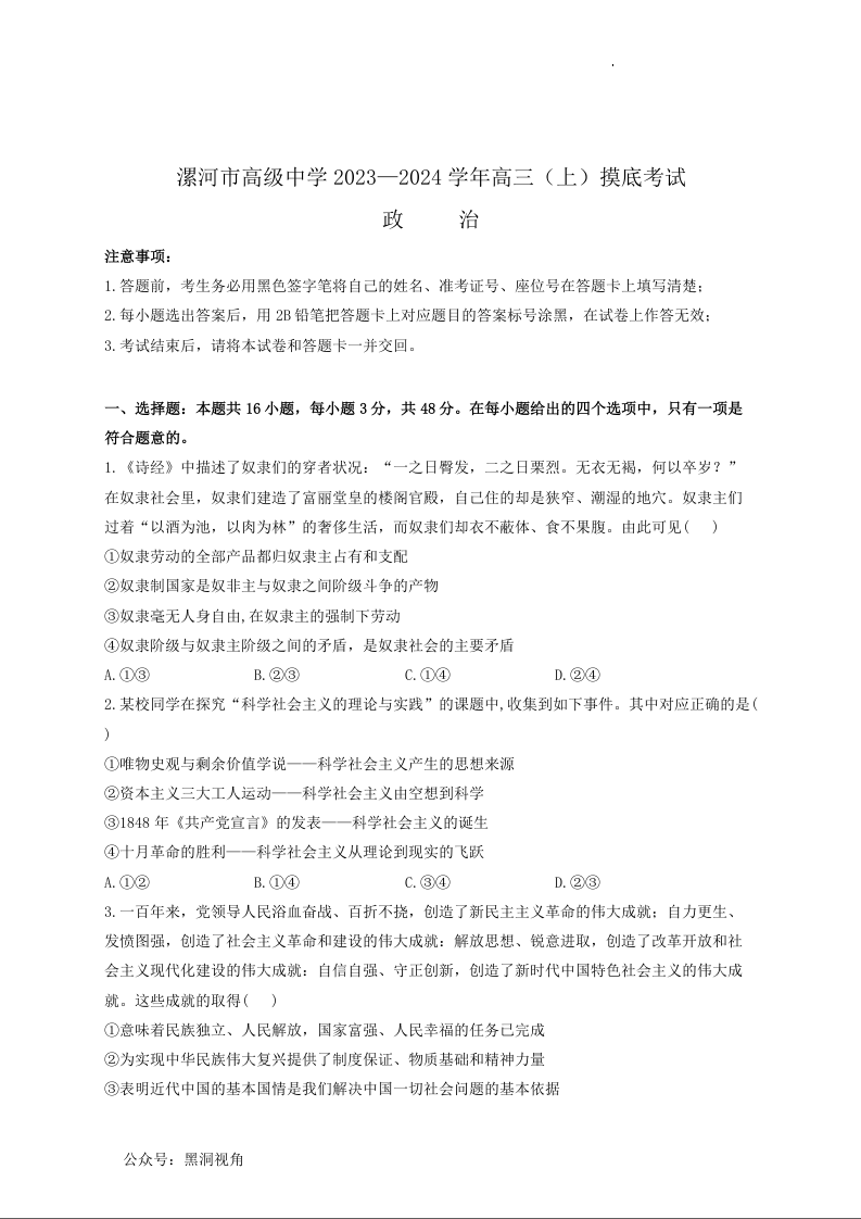 河南省漯河市高级中学2023.9高三年级摸底考试政治