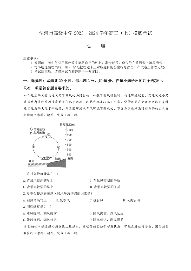 河南省漯河市高级中学2023.9高三年级摸底考试地理