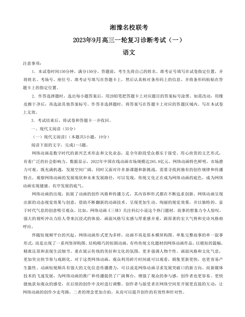 河南省湘豫名校2024.9高三年级联合月考试题语文+答案